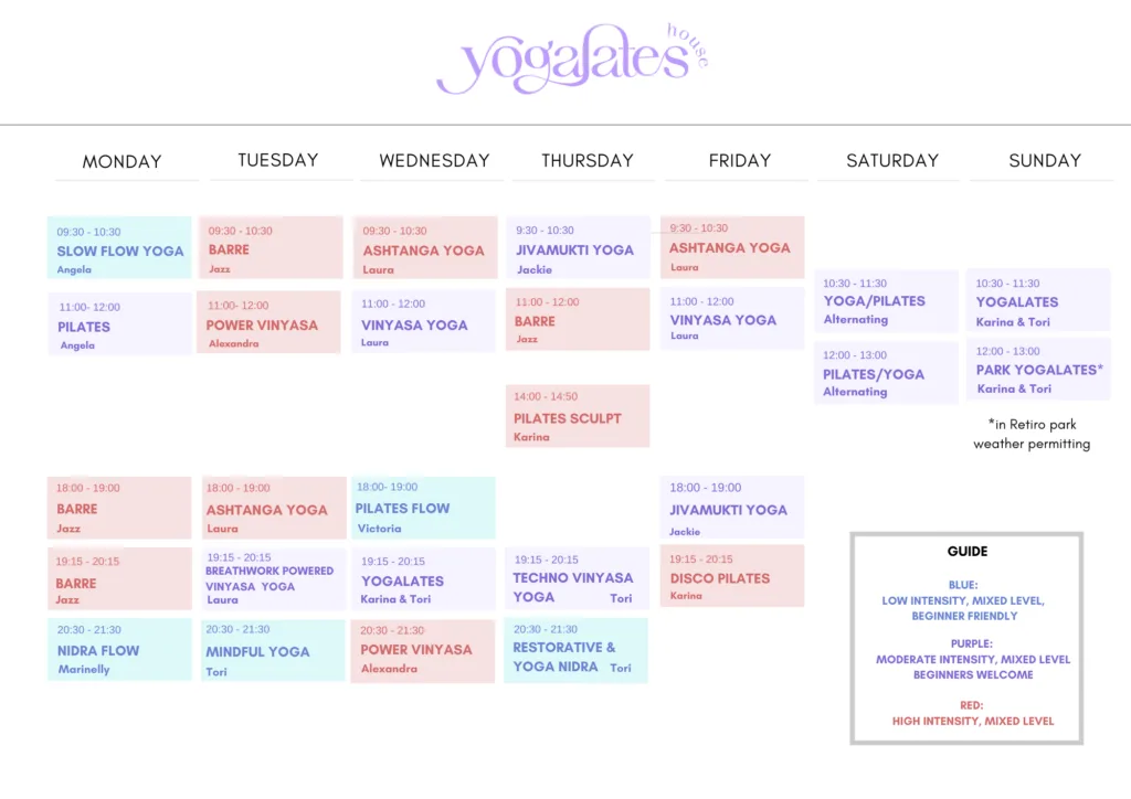Ofrecemos diversas clases de yoga en inglés (Ashtanga, Vinyasa, Nidra, Power Vinyasa y Jivamukti). Clases de pilates en inglés (Pilates clásico, Pilates Flow, Pilates Sculpt y Pilates Social).